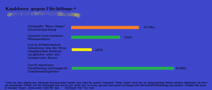 Jede Packung der neuen Exquisit Blue Chips enthält Gold garantiert zweifelhafter Herkunft. Die Arbeitsbedingungen in den afrikanischen Goldminen sind katastrophal und wunderbar menschenverachtend. Viele Minenarbeiter sterben sehr früh, sehr qualvoll, und verdienen dabei so gut wie überhaupt kein Geld. Auch  die Landwirtschaft in der näheren Umgebung der Goldminen fordert seine Opfer. Durch Schwermetallbelastung des Bodens und des Wassers im Umkreis von einigen Kilometern um die Mine sterben tausende, die mit dem Goldabbau nicht einmal etwas zu tun haben. Zu allerletzt werden auch die durch den Goldabbau verwitweten Familien schwer getroffen, da ihr Einkommen quasi nicht mehr existiert. Im Regelfall sterben auch diese potentiell wirtschaftsflüchtigen relativ zeitnah.